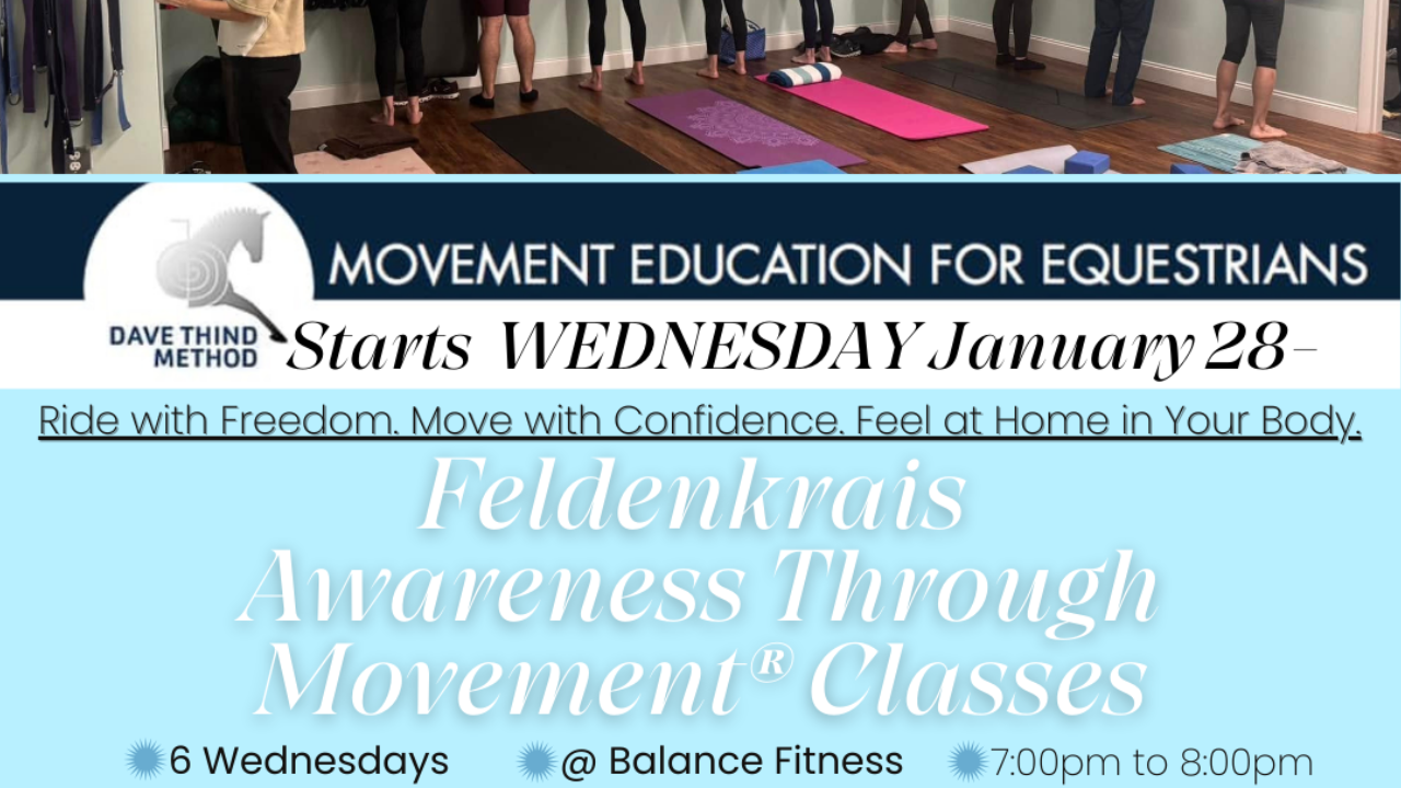 The Dave Thind Method (DTM) is all about that same Feldenkrais journey, but Dave, an international-level dressage rider, invites the participant to imagine applying those micro awarenesses to riding a horse. The ideal equestrian result is maximum effectiveness with minimal aids. Harmony grows from the economy and ease of movement, awareness and clarity that is learned while lying, sitting or standing quietly on a mat in class. The Feldenkreis journey—with Dave’s group classes or individual work—is enlightening and delightful. Try it. Your horse will thank you."